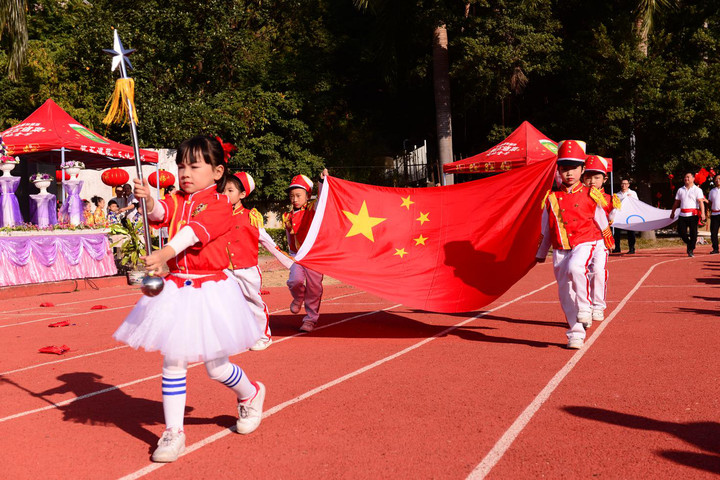 在主持人一聲“閃亮登場”的口令中,孩子們踏著歡快的步伐入場了。只見他們每個人的臉上都掛著喜悅的笑容,揮舞著手中的道具,精神抖擻的走過主席臺。大班孩子們的整齊有力,中班小朋友們的活力四射,小班寶寶們的天真可愛。