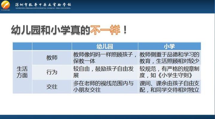 幼兒園和小學的不同之處在于學習生活環(huán)境的變化、生活內容的變化、師生關系的變化、教學方法的變化、行為規(guī)范的變化、家長和老師期望值的變化。