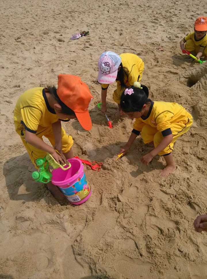 第一個(gè)“堆沙比賽”活動(dòng),在玩的過程中家長比孩子還要激動(dòng),這能看出家長們?nèi)谌氲交顒?dòng)里,孩子通過跟家長一起體驗(yàn)第一個(gè)游戲,大大增進(jìn)親子的感情,體驗(yàn)互動(dòng),積極參與的樂趣。