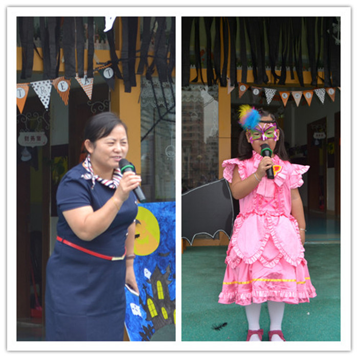 活動的第一個環(huán)節(jié),“淘氣鬼”賣萌,小朋友們都穿著奇裝異服,跟著音樂的節(jié)奏萌萌的走了一場別具一格的秀。全園的孩子站在一起時場面是非常壯觀的呀!既然是西方的節(jié)日,那就少不了語言是滲透啦,英語老師邀請了萬圣節(jié)的幾個突出的角色裝扮的小朋友,讓孩子們一起認(rèn)識這些角色的英語怎么說,孩子們學(xué)得可認(rèn)真啦!最搞笑的要數(shù)老師的游戲“瘋狂木乃伊”啦,看著每個級組的老師代表在臺上合作將另一個老師包成“木乃伊”孩子們都很激動,紛紛給自己的老師加油,讓整個活動達(dá)到了高潮。