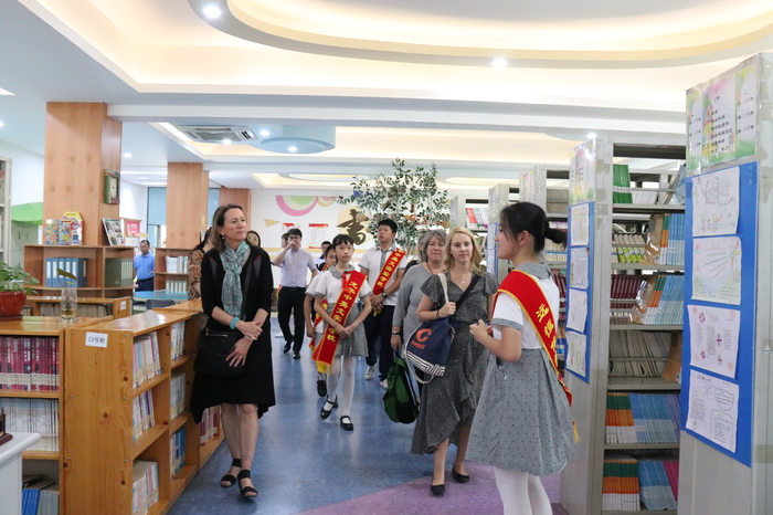 參觀訪問(wèn)代表團(tuán)首先實(shí)地考察了我校高中美術(shù)專業(yè)班、創(chuàng)客實(shí)踐工作室、社會(huì)資源中心、行政服務(wù)中心、圖書(shū)資源中心、小班化精品課堂等場(chǎng)室及學(xué)生學(xué)習(xí)情況,在集團(tuán)及學(xué)校領(lǐng)導(dǎo)的陪同下,小學(xué)、初中、高中學(xué)生代表全程用英語(yǔ)對(duì)美國(guó)客人進(jìn)行了介紹。來(lái)賓對(duì)我校一流的資源配置、學(xué)生良好的學(xué)習(xí)狀態(tài)表示贊賞,紛紛拍照留念。