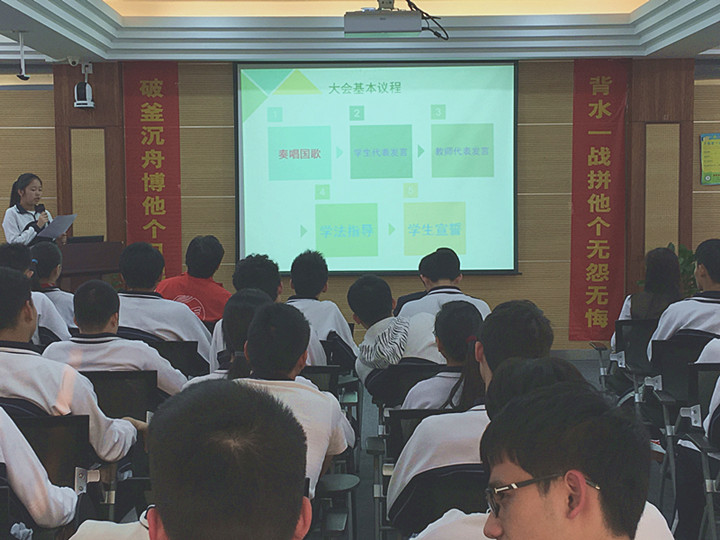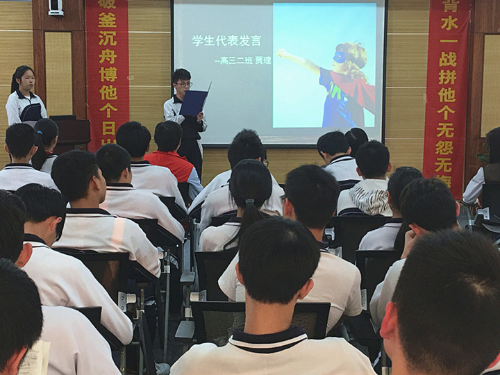 下午5時許,學(xué)生會主持人梁佳婷同學(xué)宣布會議開始。大會在嘹亮的國歌聲中拉開序幕,全體師生起立,奏唱國歌。首先,高三(2)班的賈理同學(xué)代表全體高三學(xué)生發(fā)言。他說:“少年自有少年狂,藐昆侖,笑呂梁,磨劍十年,今將試鋒芒!如果說之前的十二年是漫長的馬拉松,那么現(xiàn)在,我們已進入那最后的沖刺階段。讓我們不負(fù)父母的期盼,不負(fù)恩師的囑托,不負(fù)學(xué)校的厚望,頑強拼搏,全力以赴,鑄就輝煌!”