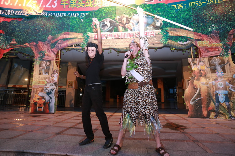在亞馬遜叢林探險(xiǎn)之篝火晚會(huì)上,備受同學(xué)們喜愛的外教Keiron(主持人)以一身“Tarzan”(人猿泰山)的裝扮出場(chǎng),獨(dú)特風(fēng)格魅力,并攜帶著“大猩猩”bunbun,吸引了在場(chǎng)所有人的目光。外教們以叢林動(dòng)物裝扮亮相時(shí),活動(dòng)現(xiàn)場(chǎng)響起一陣陣此起彼伏的歡呼聲,伴隨著熊熊燃燒的篝火一次次地將晚會(huì)推向新高潮。
