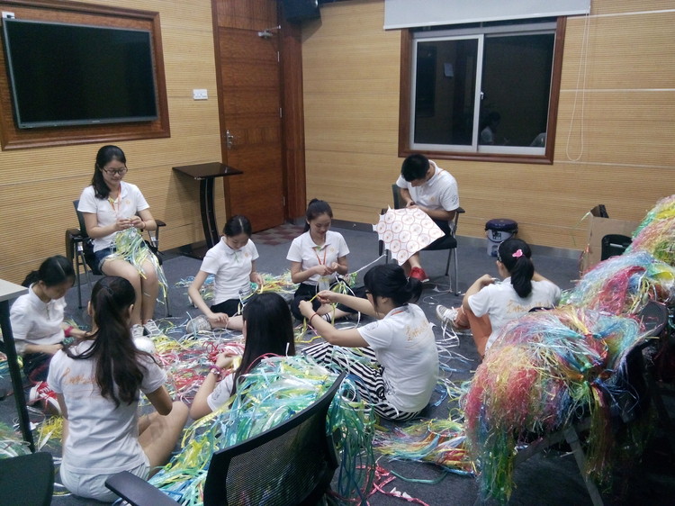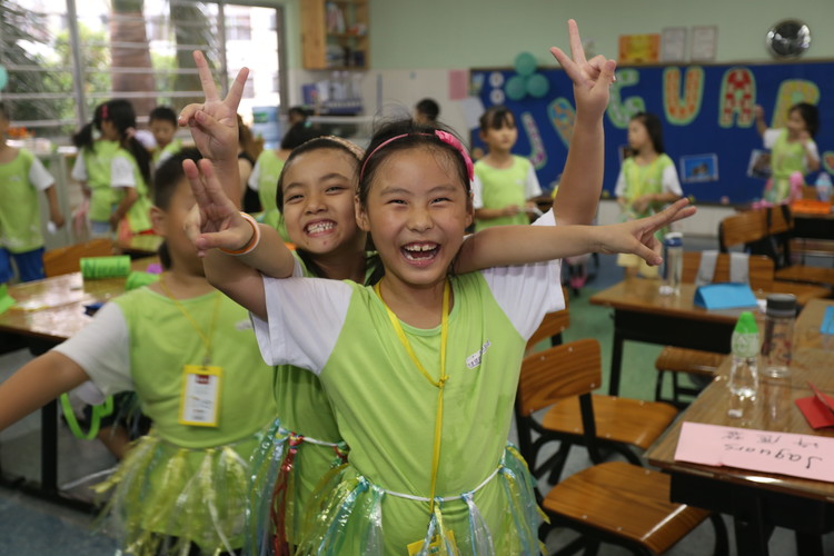 為了準(zhǔn)備此次主題活動(dòng),全體教職工們都付出了辛勤的汗水。教師們積極準(zhǔn)備材料,助教們不辭辛苦、加班加點(diǎn)地為全體師生精心趕制草裙300余條,外教Keiron用土豆雕刻出許多叢林印章,藝體教師們?yōu)楹⒆觽冄b扮各種叢林造型的面部彩繪、蓋上叢林印章,為晚會(huì)營造了良好的亞馬遜叢林氛圍。
