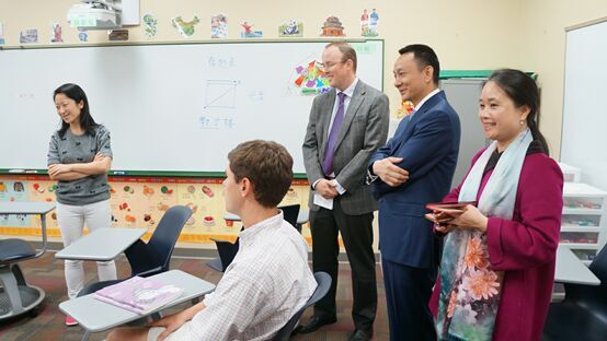 4月22日,宋總、麥總一行來到西部加利福利亞州洛杉磯,訪問當?shù)刈钪囊凰⒏咧楔D―Granada Hillls Charter高中。該校在學術(shù)方面獲得極高成就,分別于2012、2013、2015年獲得全美學術(shù)全能冠軍獎項,除此之外,學校在體育訓練、課外課程培養(yǎng)等方面都極為重視??疾靾F來到各個教室參觀,與授課老師進行深入交流與探討。